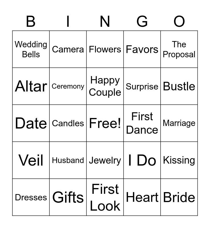 This bingo card has a free space and 53 words: Best Man, Bride, Wife, Heart, Husband, Bubbles, Camera, Love, Altar, Vows, Ceremony, Ketubah, Kissing, I Do, Lovebirds, Dresses, Happy Couple, First Dance, Food and Drinks, The Proposal, Candles, Groom, Surprise, Wedding Bells, Diamond Ring, Gifts, Bouquet, Suits, Boutonniere, Bustle, Celebrate, Ceterpieces, Chuppah, Corsage, Engagement, Cards, Favors, First Look, Flowers, Cake, Ice Cream, Invitations, Marriage, Procession, Necklace, Jewelry, Rehearsal, RSVP, Date, Veil, Usher, Ring Bearer and Flower Girl.
