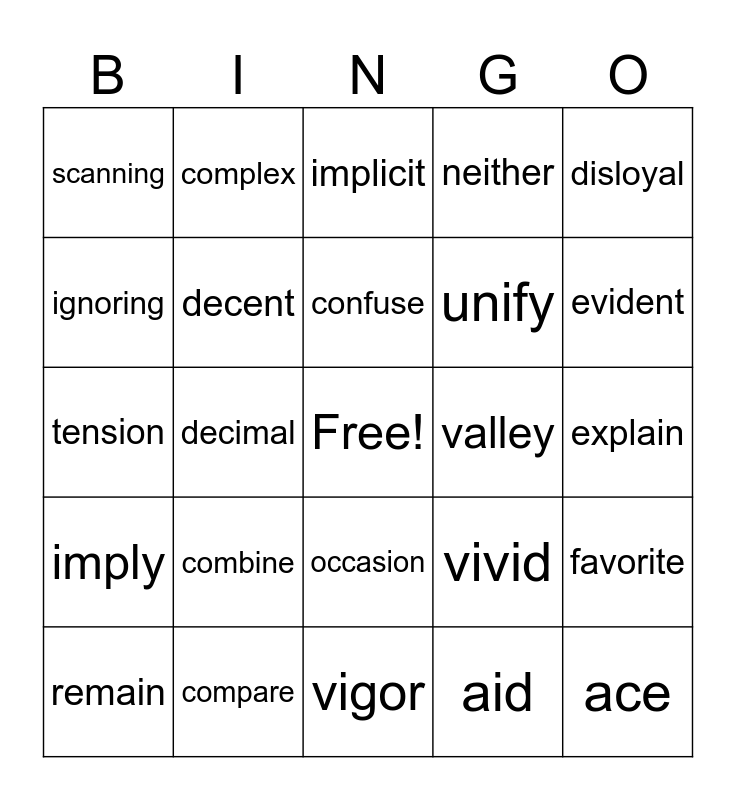 This bingo card has a free space and 24 words: combine, compare, confuse, remain, disloyal, scanning, ignoring, complex, valley, occasion, unify, tension, vivid, favorite, decent, aid, explain, implicit, evident, decimal, ace, imply, neither and vigor.