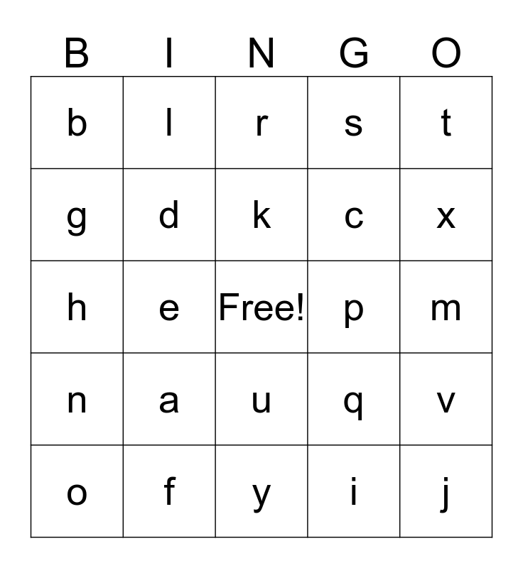 This bingo card has a free space and 24 words: a, f, k, o, t, b, g, l, p, u, c, h, q, v, d, i, m, r, x, e, j, n, s and y.