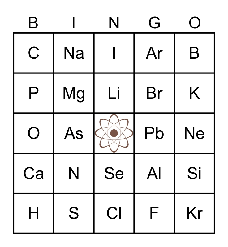 This bingo card has a free space and 24 words: H, N, Li, F, B, C, Na, I, Pb, Ne, O, Mg, Al, Si, P, S, Cl, Ar, K, Ca, As, Se, Br and Kr.