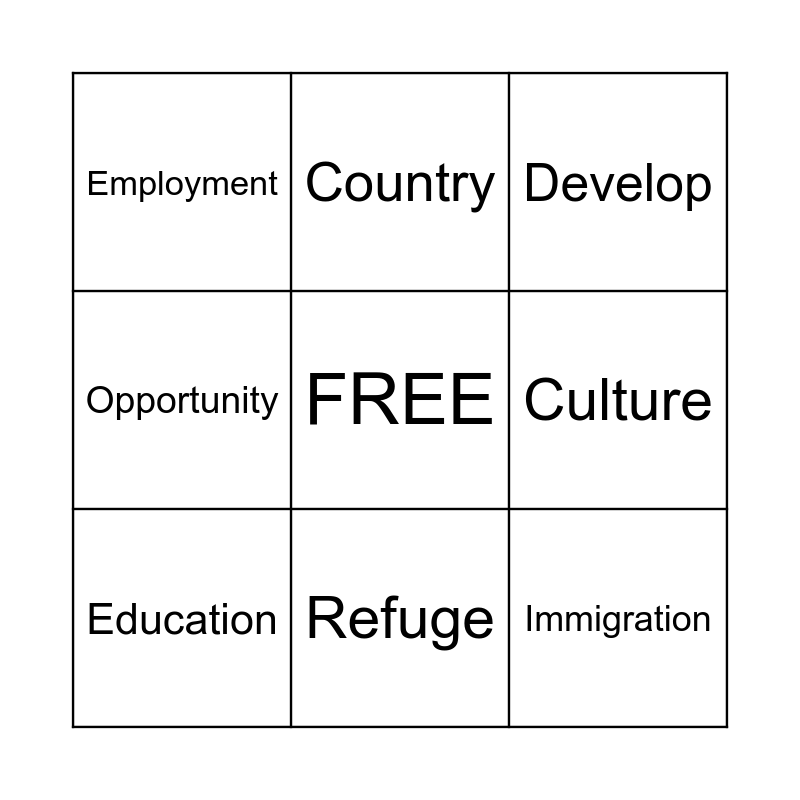 This bingo card has a free space and 8 words: Culture, Develop, Country, Education, Employment, Immigration, Opportunity and Refuge.