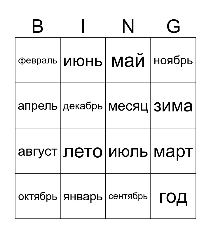 This bingo card has 16 words: январь, март, май, февраль, август, июнь, июль, сентябрь, апрель, декабрь, oктябрь, нoябрь, летo, зима, месяц and гoд.