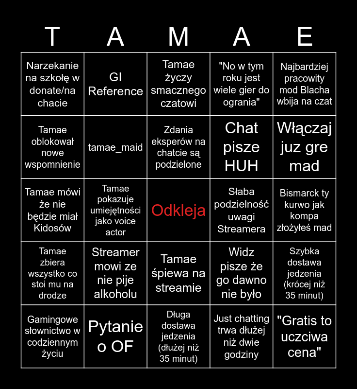 This bingo card has a free space and 166 words: Nie wygodnie mi się siedzi, Zamawianie jedzenia, "Trudniejsze od maleni?", "ja nie wiem czy to przejdę", Zdania eksperów na chatcie są podzielone, Chat pisze 2137, "zamówiłeś coś?", Zdrobnienia, Maćki na chacie spoilerują, Chat musi podpowiedzieć bo tamae nie wie co dalej KEKW, Wspomnienie o Eldenie, Streamer opluwa donate'a, Bismarck ty kurwo jak kompa złożyłeś mad, Inny Streamer na chatcie, "idę do toalety zw", "rączki umyte? mad", Jakby się tu zgubić Popoga moment, COPIUM Moment, Męski okrzyk, Narzekanie na grę xdd, GTA Tricity, Wykup zakończenie streama (powodzenia hehe), Dzwonek do drzwi, Jedzenie zrobione samemu (HARD), Czatownik dostaje timeouta'a, TFU TFU, Temat przedłużanego streama, Pytanie o muzykę, "Kiedy face reaveal?", Autobus, "Ej słuchajcie giga akcja sie odjebała", Pytanie jakie gry będziesz ogrywać itp., Pytanie o OF, Schizofrenia, Narzekanie na szkołę w donate/na chacie, Wspomnienie o Studiach, Bugowanie gierki, Tamae mówi "kocham was czat", "No to co respek?", Tamae mówi coś mądrego (HARD), "ale mam pecha", Patologia na streamie (rzucanie padem itp), Przychodzi stary czatu (chobie), Randomowa historia z życia, Chat vibe'uje do muzyki, Tamae gra w gierkę po raz pierwszy, Tamae zmienia gierkę, Just chatting trwa dłużej niż godzinę, Just chatting trwa dłużej niż dwie godziny, Tamae mówi o jakiś serialu/anime, Chat pisze HUH, Chat życzy Tamae smacznego, Szybka dostawa jedzenia (krócej niż 35 minut), Długa dostawa jedzenia (dłużej niż 35 minut), Tamae mówi dziwnym głosem, Tamae nie umie czytać, Streamer spóźnia się na stream, Siedzisz na streamie dłużej niż 4 godziny, Tamae mówi/czyta suchara, Curue pisze pojedyńczą emotkę na chat, Ktoś wysyła orginalną emotkę z Twitcha (nie z 7TV), Przywitaj się z nowym Chatownikiem, Pomóż innemu chatownikowi gdy pyta o coś na chatcie, Wyślij paste na chat (nie spamuj), Tamae panikuje, Wystraszony Tamae podczas jumpscare'a, Tamae pokazuje umiejętności jako voice actor, Tamae pijany lub niespełna rozumu, Tamae coś pisze na chacie, Tamae śpiewa na streamie, Tamae wspomina o dzieciństwie, Przywitaj się na czacie (jak ktoś ci odpisze, zaliczone), Tamae życzy smacznego czatowi, Tamae narzeka na jedzenie/dostawe, Tamae opluwa suba, Czatownik dostaje VIPA, Widz pisze że go dawno nie było, Jeżeli byłeś na wczorajszym streamie może odznaczyć to pole, Jeżeli byłeś na każdym streamie w poprzednim tygodniu możesz odnaczyć to pole, Stream trwa 10h, Tamae wstawił dzisiaj Tweeta (zapowiedź Streama się nie liczy), GI Reference, Jedna emotka została napisana na chacie przynajmniej 10 razy z rzędu, Zostaw Like pod najnowszym filmem Tamae, Tamae mówi coś z brytyjskim akcentem, Ktoś narzeka na grę na streamie, "No w tym roku jest wiele gier do ogrania", Tamae gra w coś z widzami/innym streamerem, Mózg paruje od trudnej zagadki, Tamae chodzi po pokoju, Bieganie w kółko, Tamae zbiera wszystko co stoi mu na drodze, Napisz Prayge na czacie w momencie zwątpienia w streamera, KONTROLA ZDROWIA zrób 10 pompek... dla własnego zdrowia TROLL, Włączaj juz gre mad, Wiązanka przekleństw, Streamer mówi "Kontent", Tamae mówi słowo "Trychotomia' (nie możesz prosić żeby użył tego słowa, powodzenia :3 ), Sprawdz drugą kamerę Tamae wpisując !cam2, Tamae wrócił z ZW szybciej niż 15 sekund (speedrun), Trzeba przedłużyć Dobę do 36/48 godzin, Tamae oblokował nowe wspomnienie, Temat MMO od Riot Games, Flashbacki z beznadziejnych gier, Tamae i alergia, Gamingowe słownictwo w codziennym życiu, Tamae i nowy pakiet internetu, Anime Cyce, Chat pisze że Tamae jest niemiły, Wygodnie się siedzi, Pojawia się Sub gift, Słaba podzielność uwagi Streamera, Kanały wracają monkaChrist, Za pierwszym, Tamae narzeka na Polskę (inflacja się nie liczy), Jebać Politykę, Kryzys wiary Tamae, Maciek i Rodzina, Babcia z Mafii, Tamae wraca do Genshina bo kaski zabrakło (łatwe), Słaby punkt: Ślepota, Brak 3cm do mężczyzny, Niedowaga Tamae, Zdrowe odżywaianie się, "Gratis to uczciwa cena", Tamae o swoich snach, Tamae mówi emotkami, Streamer uratował się przed tragedią, Streamer opowiada kolejny raz tą samą historię (skomentuj "CLASSIC LULW" ), Widzowie pytają się o wiek strimera, Streamer mowi ze nie pije alkoholu, Streamer znowu rozwalił zegar biologiczny, Szczanie do zlewu, Dodanie nowej emotki, Tamae nie ma prawa jazdy, Tamae mówi że nie będzie miał Kidosów, Tamae dziękuje że chat poprawia mu humor, Tamae i plany na przyszłość, tamae_maid, Bottomae, "Czy będzie x na Yt?", Wszytko jest dobre z Ketchupem, Pojawił się Hype Train, Tamae ignoruje modów, Filozoficzny wywód chatownika, Widz pyta czy może bana/timeout'a, Tamae sam zmienia Gierkę, Niemiecki to chujowy język, Tamae udaje Makłowicza, Azjatyckie żarcie, Przepraszam was widzowie, "Mam prawo kochać cyce", "chcesz podpowiedz?", Najbardziej pracowity mod Blacha wbija na czat, "YŚ YŚ", Wydaj 10k punktów na zbonbardowanie streamera, Tamae robi głupią Minę, Streamer buja się do muzyki, Przychodzi widz z tiktoka, Oglądanie Pałkersona/youtube, Nie kończę streama póki...., KATEGORIA POLICE, Udawanie króla Juliana (litości), "TUGEDA", Laguje Avatar and "Jak ma się czystego chuja to nie trzeba myć rąk".