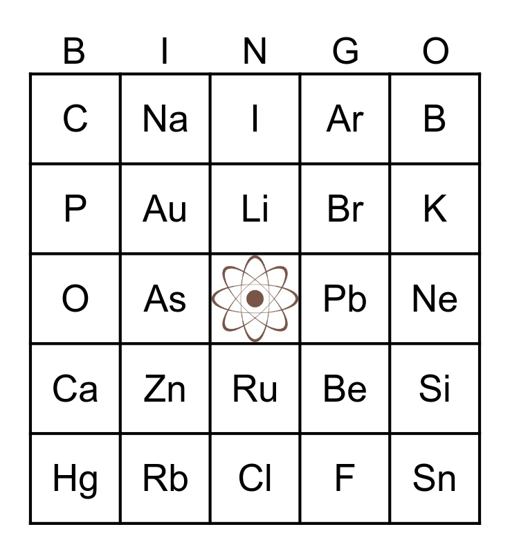 This bingo card has a free space and 24 words: Hg, Zn, Li, F, B, C, Na, I, Pb, Ne, O, Au, Be, Si, P, Rb, Cl, Ar, K, Ca, As, Ru, Br and Sn.