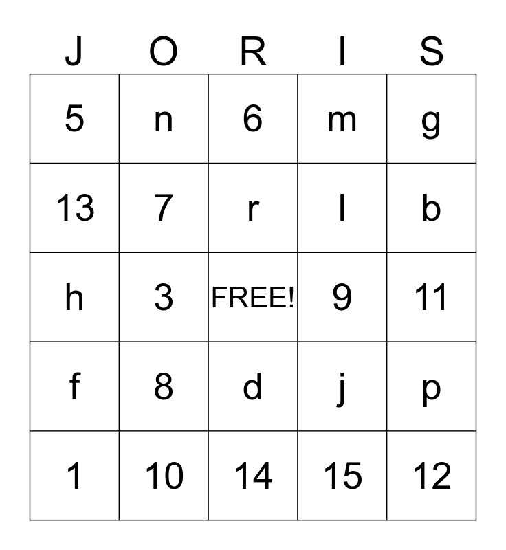 This bingo card has a free space and 29 words: 1, 2, 3, 4, 5, 6, 7, 8, 9, 10, 11, 12, 14, 15, b, c, d, f, g, h, j, k, l, 13, m, n, p, r and t.