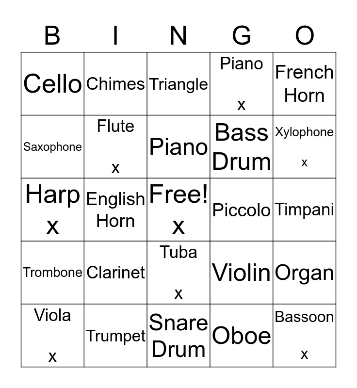 This bingo card has a free space and 24 words: Clarinet, Trumpet, Piano, Viola x, French Horn, Cello, Saxophone, Chimes, Piccolo, Tuba x, Bass Drum, Harp x, Violin, Organ, Flute x, Oboe, Timpani, Triangle, Xylophone x, English Horn, Bassoon x, Trombone, Piano x and Snare Drum.