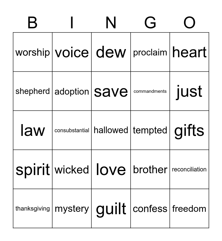 This bingo card has 25 words: wicked, guilt, save, thanksgiving, heart, worship, shepherd, voice, tempted, love, commandments, law, brother, reconciliation, adoption, freedom, gifts, dew, just, consubstantial, hallowed, mystery, spirit, proclaim and confess.