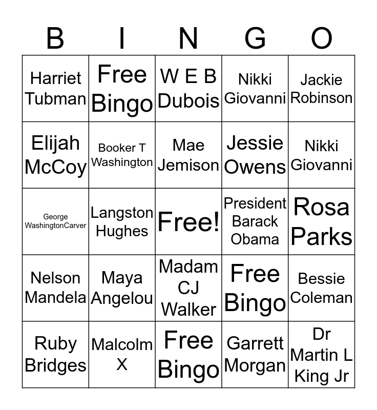 This bingo card has a free space and 24 words: Maya Angelou, Malcolm X, Mae Jemison, Ruby Bridges, Jackie Robinson, Harriet Tubman, Elijah McCoy, Free Bingo, President Barack Obama, Madam CJ Walker, Jessie Owens, George WashingtonCarver, Free Bingo, Bessie Coleman, Booker T Washington, Garrett Morgan, Rosa Parks, W E B Dubois, Nikki Giovanni, Langston Hughes, Dr Martin L King Jr, Nelson Mandela, Nikki Giovanni and Free Bingo.