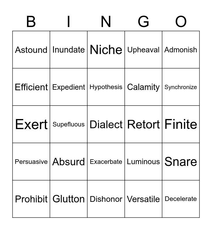 This bingo card has 25 words: Absurd, Dishonor, Hypothesis, Prohibit, Admonish, Astound, Efficient, Inundate, Retort, Exacerbate, Calamity, Exert, Luminous, Snare, Expedient, Decelerate, Finite, Niche, Synchronize, Supefluous, Dialect, Glutton, Persuasive, Upheaval and Versatile.