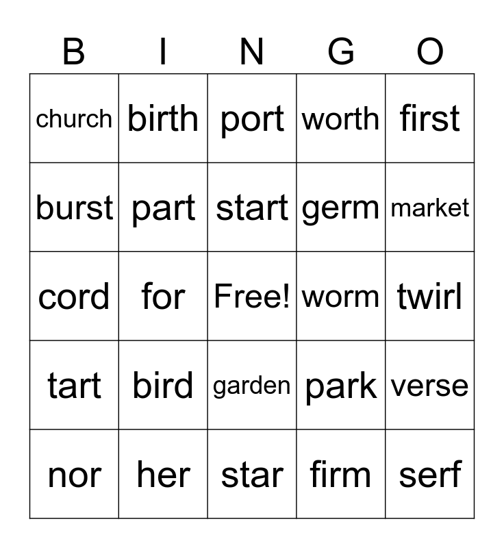 This bingo card has a free space and 55 words: mark, nor, turf, church, star, tar, part, urn, germ, hard, worth, bark, burnt, short, dart, fern, first, for, fur, serf, worm, bard, park, port, sir, start, firm, flirt, twirl, verse, word, bar, nerd, birch, burst, cord, dirt, tart, sport, horn, birth, herd, corn, harm, bird, her, dollar, doctor, march, market, order, danger, over, garden and farm.