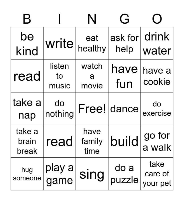 This bingo card has a free space and 24 words: read, play a game, watch a movie, hug someone, drink water, be kind, read, write, dance, have family time, have fun, take a nap, build, go for a walk, listen to music, do a puzzle, do exercise, eat healthy, have a cookie, do nothing, take care of your pet, take a brain break, ask for help and sing.