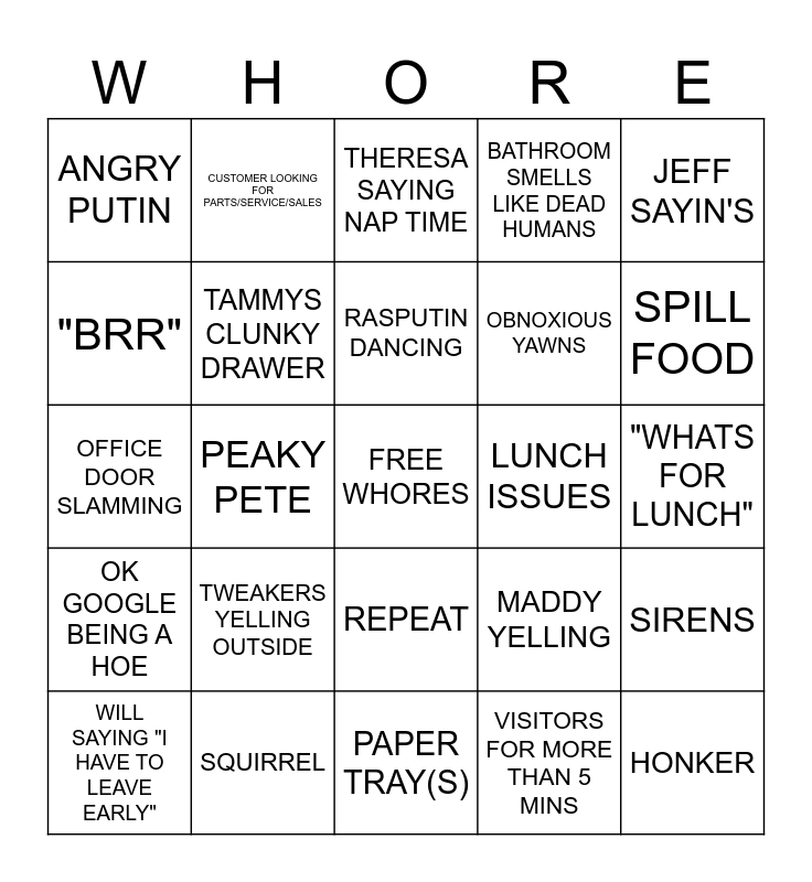 This bingo card has a free space and 24 words: TWEAKERS YELLING OUTSIDE, SQUIRREL, RASPUTIN DANCING, WILL SAYING "I HAVE TO LEAVE EARLY", JEFF SAYIN'S, ANGRY PUTIN, "BRR", CUSTOMER LOOKING FOR PARTS/SERVICE/SALES, LUNCH ISSUES, REPEAT, OBNOXIOUS YAWNS, OFFICE DOOR SLAMMING, MADDY YELLING, SIRENS, TAMMYS CLUNKY DRAWER, VISITORS FOR MORE THAN 5 MINS, "WHATS FOR LUNCH", THERESA SAYING NAP TIME, SPILL FOOD, PEAKY PETE, HONKER, OK GOOGLE BEING A HOE, BATHROOM SMELLS LIKE DEAD HUMANS and PAPER TRAY(S).