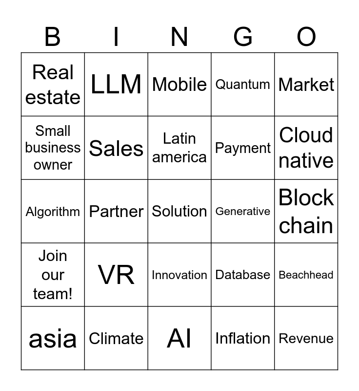 This bingo card has 25 words: VR, AI, Latin america, asia, Market, Real estate, Small business owner, LLM, Generative, Innovation, Payment, Algorithm, Database, Beachhead, Sales, Revenue, Block chain, Mobile, Cloud native, Partner, Solution, Climate, Join our team!, Quantum and Inflation.