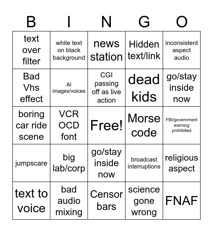 This bingo card has a free space and 54 words: Bad Vhs effect, jumpscare, text over filter, Loud sounds, go/stay inside now, eyeball spooky, Hidden text/link, bad voice acting, Bad Vhs effect, jumpscare, text over filter, Loud sounds, bad audio mixing, text to voice, scary abnormal face, Censor bars, FNAF, dead kids, doppelganger trope, FBI/government warning prohibited, broadcast interruptions, Old-timey music, Morse code, inconsistent aspect audio, emergency sirens / emergency broadcast sound, white text on black background, mascot horror animatronic, telephone call, training video, science gone wrong, the ___ incident / files / tapes, TV static, I found this at ___, unexplained glitches, news station, clearly a teenager doing an adult voice, boring car ride scene, religious aspect, analog to live action, AI images/voices, screaming then crunch, Mandela rip off, Walton rip off, local 58 rip off, big lab/corp, 2000'S settings, incorrect use of VHS filter, puppets wall of text, CGI passing off as live action, VCR OCD font, go/stay inside now, eyeball spooky, Hidden text/link and bad voice acting.