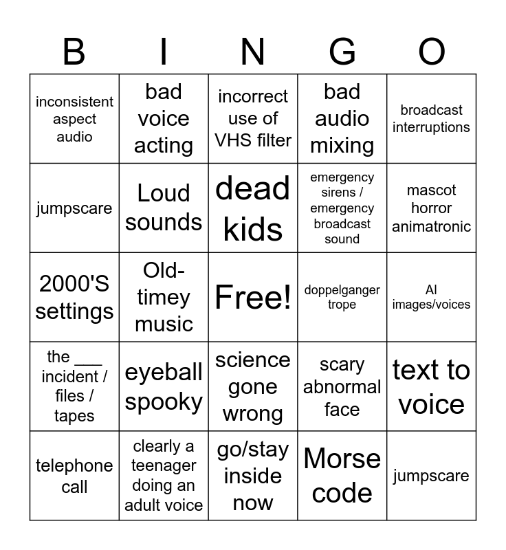 This bingo card has a free space and 49 words: Bad Vhs effect, jumpscare, VCR OCD font, go/stay inside now, eyeball spooky, Hidden text/link, bad voice acting, Bad Vhs effect, jumpscare, text over filter, Loud sounds, bad audio mixing, text to voice, scary abnormal face, Censor bars, FNAF, dead kids, doppelganger trope, FBI/government warning prohibited, broadcast interruptions, Old-timey music, Morse code, inconsistent aspect audio, emergency sirens / emergency broadcast sound, white text on black background, mascot horror animatronic, telephone call, training video, science gone wrong, the ___ incident / files / tapes, TV static, I found this at ___, unexplained glitches, news station, clearly a teenager doing an adult voice, boring car ride scene, religious aspect, analog to live action, AI images/voices, screaming then crunch, Mandela rip off, Walton rip off, local 58 rip off, big lab/corp, 2000'S settings, incorrect use of VHS filter, puppets wall of text, CGI passing off as live action and VCR OCD font.
