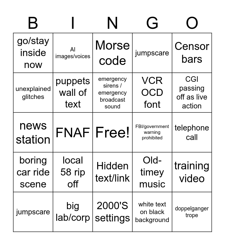 This bingo card has a free space and 55 words: Bad Vhs effect, jumpscare, VCR OCD font, go/stay inside now, 2000'S settings, incorrect use of VHS filter, puppets wall of text, CGI passing off as live action, VCR OCD font, Bad Vhs effect, jumpscare, text over filter, Loud sounds, bad audio mixing, text to voice, scary abnormal face, Censor bars, FNAF, dead kids, doppelganger trope, FBI/government warning prohibited, broadcast interruptions, Old-timey music, Morse code, inconsistent aspect audio, emergency sirens / emergency broadcast sound, white text on black background, mascot horror animatronic, telephone call, training video, science gone wrong, the ___ incident / files / tapes, TV static, I found this at ___, unexplained glitches, news station, clearly a teenager doing an adult voice, boring car ride scene, religious aspect, analog to live action, AI images/voices, screaming then crunch, Mandela rip off, Walton rip off, local 58 rip off, big lab/corp, 2000'S settings, incorrect use of VHS filter, puppets wall of text, CGI passing off as live action, VCR OCD font, go/stay inside now, eyeball spooky, Hidden text/link and bad voice acting.