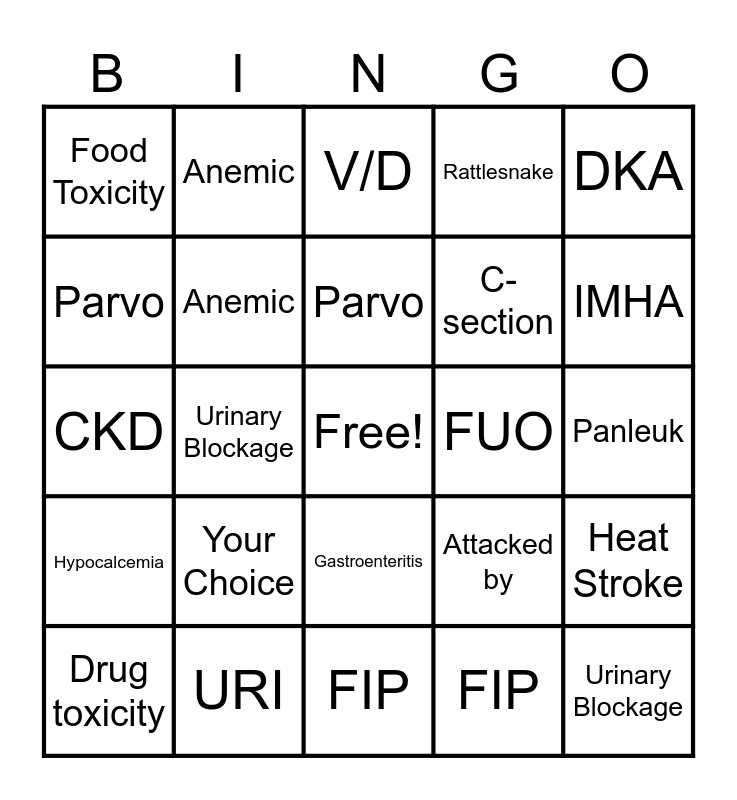 This bingo card has a free space and 76 words: V/D, V/D, V/D, V/D, FB, FB, FB, FB, HBC, HBC, HBC, Parvo, Parvo, Parvo, Parvo, Urinary Blockage, Urinary Blockage, Urinary Blockage, DKA, DKA, CKD, CKD, Anemic, Anemic, Rattlesnake, Rattlesnake, Hind Limb Fx, Hind Limb Fx, Front Limb Fx, Front Limb Fx, Heart Failure, Heart Failure, Attacked by, Attacked by, IMHA, C-section, C-section, Panleuk, Panleuk, FIP, Enucleation, Enucleation, Chest Trauma, Chest Trauma, Drug toxicity, Drug toxicity, Drug toxicity, Food Toxicity, Food Toxicity, Food Toxicity, HemoAbdomen, Gastroenteritis, Pyothorax, IMHA, Anorexia, Anorexia, Anorexia, Anorexia, Your Choice, Your Choice, Your Choice, Your Choice, Seizures, Seizures, FUO, FUO, FUO, Pyometra, Pyometra, Heat Stroke, Heat Stroke, Hypocalcemia, URI, URI, FIP and AKI.