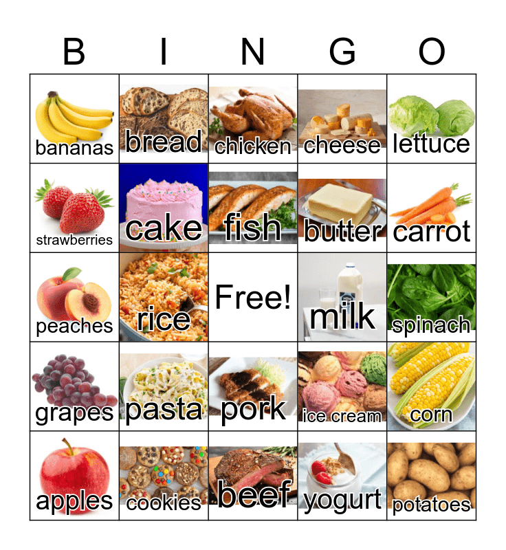 This bingo card has 24 images, a free space and 24 words: apples, pasta, fish, yogurt, lettuce, bananas, bread, chicken, milk, spinach, peaches, cake, ice cream, corn, strawberries, cookies, beef, cheese, carrot, grapes, rice, pork, butter and potatoes.