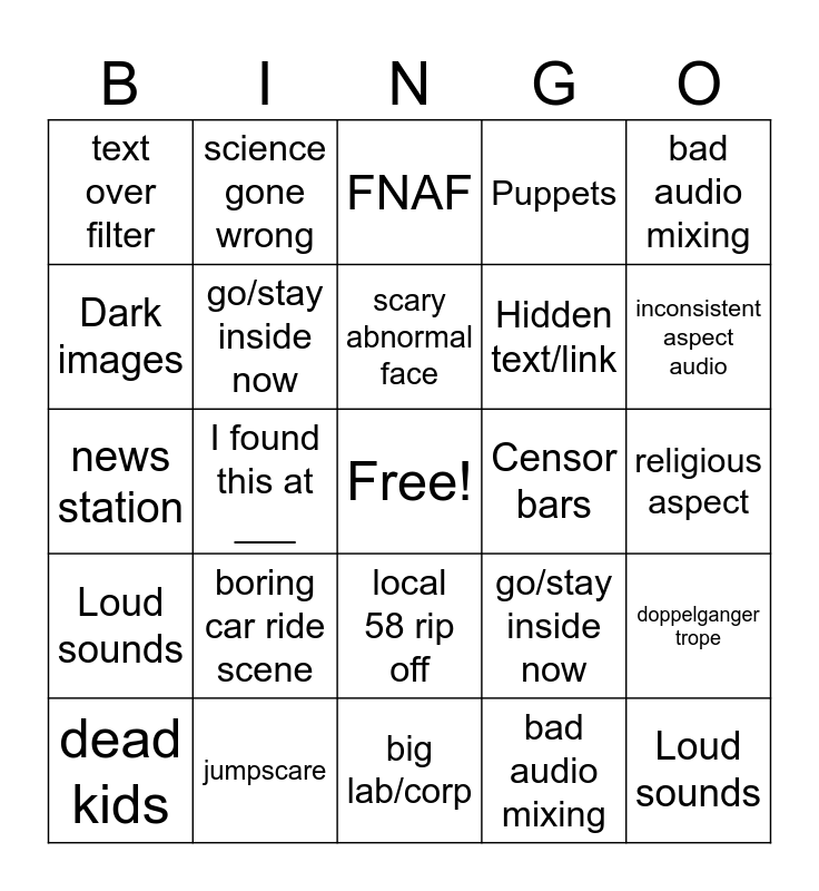 This bingo card has a free space and 59 words: Bad Vhs effect, jumpscare, text over filter, Loud sounds, bad audio mixing, text to voice, go/stay inside now, eyeball spooky, Hidden text/link, bad voice acting, Puppets, Door knocking, Dark images, Bad Vhs effect, jumpscare, text over filter, Loud sounds, bad audio mixing, text to voice, scary abnormal face, Censor bars, FNAF, dead kids, doppelganger trope, FBI/government warning prohibited, broadcast interruptions, Old-timey music, Morse code, inconsistent aspect audio, emergency sirens / emergency broadcast sound, white text on black background, mascot horror animatronic, telephone call, training video, science gone wrong, the ___ incident / files / tapes, TV static, I found this at ___, unexplained glitches, news station, clearly a teenager doing an adult voice, boring car ride scene, religious aspect, analog to live action, AI images/voices, screaming then crunch, Mandela rip off, Walton rip off, local 58 rip off, big lab/corp, 2000'S settings, incorrect use of VHS filter, puppets wall of text, CGI passing off as live action, VCR OCD font, go/stay inside now, eyeball spooky, Hidden text/link and bad voice acting.