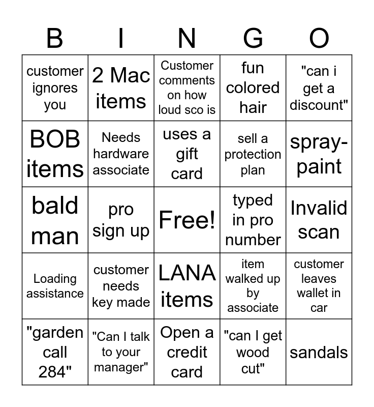 This bingo card has a free space and 24 words: customer needs key made, "Can I talk to your manager", uses a gift card, "garden call 284", "can i get a discount", customer ignores you, BOB items, 2 Mac items, typed in pro number, LANA items, sell a protection plan, bald man, item walked up by associate, customer leaves wallet in car, Needs hardware associate, "can I get wood cut", Invalid scan, Customer comments on how loud sco is, spray-paint, pro sign up, sandals, Loading assistance, fun colored hair and Open a credit card.