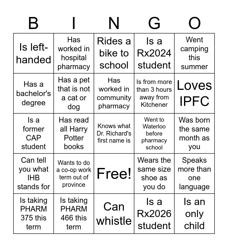 This bingo card has 26 words: Free!, Is a Rx2026 student, Has worked in community pharmacy, Is taking PHARM 466 this term, Went camping this summer, Is left-handed, Has a bachelor's degree, Has worked in hospital pharmacy, Was born the same month as you, Wears the same size shoe as you do, Is from more than 3 hours away from Kitchener, Is a former CAP student, Speaks more than one language, Is taking PHARM 375 this term, Has read all Harry Potter books, Can play a musical instrument, Is a Rx2024 student, Can tell you what IHB stands for, Rides a bike to school, Knows what Dr. Richard's first name is, Loves IPFC, Can whistle, Went to Waterloo before pharmacy school, Wants to do a co-op work term out of province, Has a pet that is not a cat or dog and Is an only child.