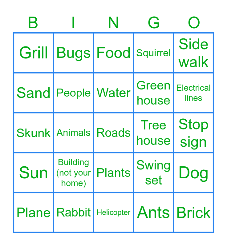 This bingo card has a free space and 37 words: Car, Tree, Bird, People, Dog, Building (not your home), Water, Rock, Side walk, Fire, Animals, Squirrel, Brick, Stop sign, Sand, Sun, Moon, Food, Plants, Tree house, Grill, Electrical lines, Plane, Helicopter, Trash, Ants, Bugs, Dog toy, Trampoline, Cat, Pool, Rabbit, Skunk, Hot tub, Swing set, Green house and Outside sofa.