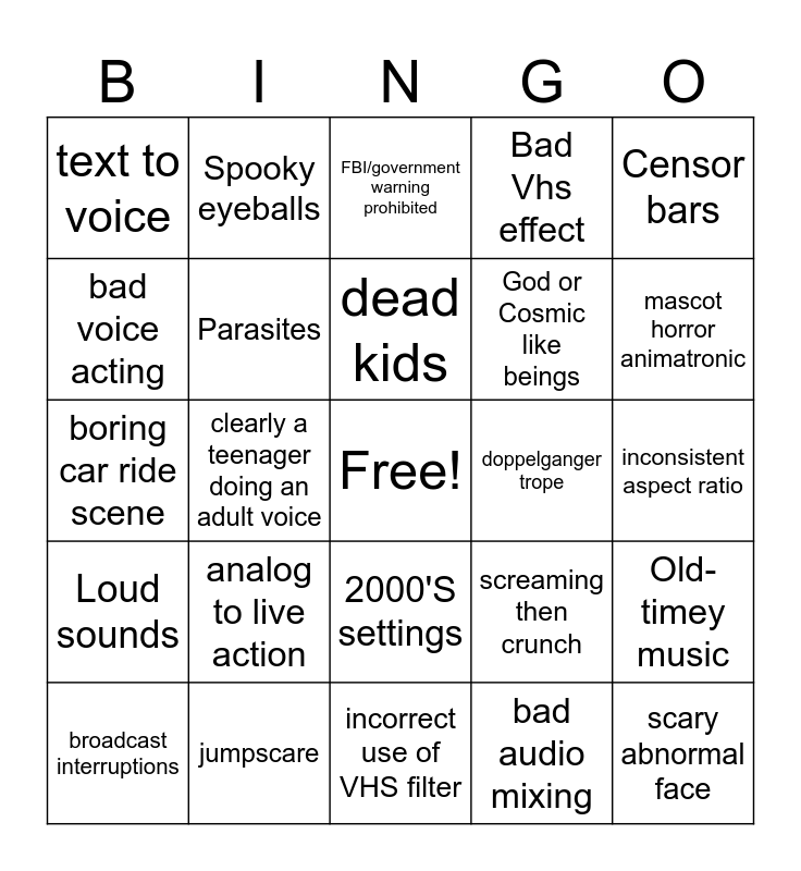 This bingo card has a free space and 58 words: Bad Vhs effect, jumpscare, text over filter, Loud sounds, bad audio mixing, Zombie, Parasites, Creature's, God or Cosmic like beings, Typos, Bad Vhs effect, jumpscare, text over filter, Loud sounds, bad audio mixing, text to voice, scary abnormal face, Censor bars, FNAF, dead kids, doppelganger trope, FBI/government warning prohibited, broadcast interruptions, Old-timey music, Morse code, inconsistent aspect ratio, emergency sirens / emergency broadcast sound, white text on black background, mascot horror animatronic, telephone call, training video, science gone wrong, the ___ incident / files / tapes, TV static, I found this at ___, unexplained glitches, news station, clearly a teenager doing an adult voice, boring car ride scene, religious aspect, analog to live action, AI images/voices, screaming then crunch, Mandela rip off, Walton rip off, local 58 rip off, big lab/corp, 2000'S settings, incorrect use of VHS filter, puppets, wall of text, CGI passing off as live action, VCR OCD font, go/stay inside now, Spooky eyeballs, Hidden text/link, bad voice acting and Cute horror.