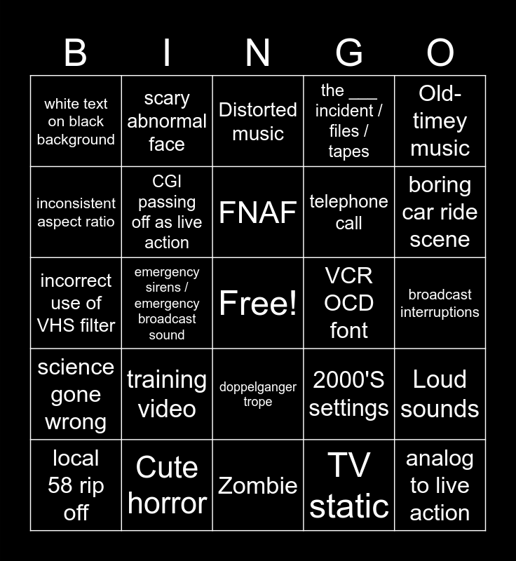 This bingo card has a free space and 67 words: Bad Vhs effect, jumpscare, text over filter, Loud sounds, bad audio mixing, text to voice, scary abnormal face, Censor bars, FNAF, dead kids, doppelganger trope, FBI/government warning prohibited, broadcast interruptions, Old-timey music, Morse code, inconsistent aspect ratio, emergency sirens / emergency broadcast sound, white text on black background, mascot horror animatronic, telephone call, training video, science gone wrong, the ___ incident / files / tapes, TV static, I found this at ___, unexplained glitches, news station, clearly a teenager doing an adult voice, boring car ride scene, religious aspect, analog to live action, AI images/voices, screaming then crunch, Mandela rip off, Walton rip off, local 58 rip off, big lab/corp, 2000'S settings, incorrect use of VHS filter, puppets, wall of text, CGI passing off as live action, VCR OCD font, go/stay inside now, Spooky eyeballs, Hidden text/link, bad voice acting, Cute horror, Slideshow horror, Transformation horror, Distorted music, Skin walkers, Door knocking, Dark images, Redacted, Zombie, Parasites, Creature's, God or Cosmic like beings, wall of text, CGI passing off as live action, VCR OCD font, go/stay inside now, Spooky eyeballs, Hidden text/link, bad voice acting and Cute horror.