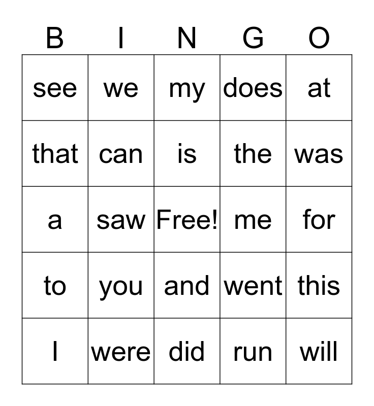 This bingo card has a free space and 24 words: you, were, is, I, at, see, that, we, me, and, the, a, went, this, can, run, for, my, was, saw, will, to, does and did.