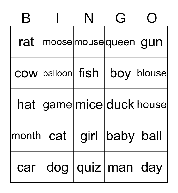 This bingo card has a free space and 24 words: cat, dog, fish, car, gun, rat, cow, moose, duck, girl, boy, hat, baby, ball, balloon, man, house, mouse, blouse, game, day, month, queen and quiz.