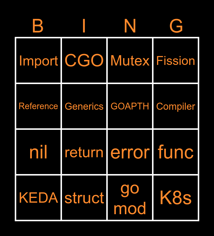 This bingo card has 24 words: Maps, go fmt, Compiler, Loop, Reference, Import, Generics, CGO, struct, Pointer, nil, error, defer, go doc, GOAPTH, Gopher, go mod, Mutex, return, func, KEDA, K8s, Fission and Krius.