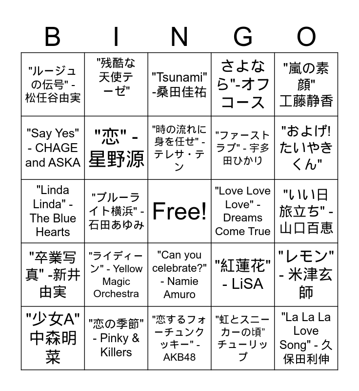 This bingo card has a free space and 25 words: "ライディーン" - Yellow Magic Orchestra, "恋するフォーチュンクッキー" - AKB48, "時の流れに身を任せ" - テレサ・テン, "少女A" 中森明菜, "嵐の素顔" 工藤静香, "ルージュの伝号" - 松任谷由実, "Say Yes" - CHAGE and ASKA, "残酷な天使テーゼ", "Love Love Love" - Dreams Come True, "Can you celebrate?" - Namie Amuro, "ファーストラブ" - 宇多田ひかり, "Linda Linda" - The Blue Hearts, "紅蓮花" - LiSA, "レモン" - 米津玄師, "恋" - 星野源, "スキヤキ" -坂本九, "いい日旅立ち" - 山口百恵, "Tsunami" -桑田佳祐, "およげ!たいやきくん", "ブルーライト横浜" - 石田あゆみ, "La La La Love Song" - 久保田利伸, "恋の季節" - Pinky & Killers, "卒業写真" -新井由実, さよなら"-オフコース and "虹とスニーカーの頃” チューリップ.