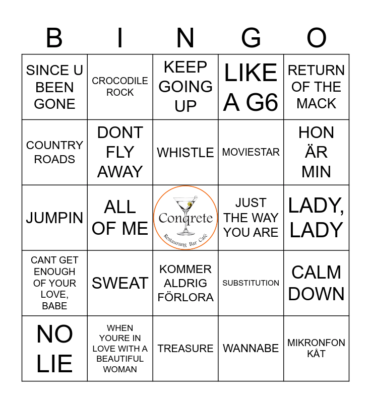 This bingo card has a free space and 81 words: SINGLE SOON, BOTH, KEEP GOING UP, DO SI DO, PRADA, CRUEL SUMMER, ENOUGH IS ENOUGH, BARBIE WORLD, WAKE ME UP BEFORE YOU GO-GO, ON TOP OF THE WORLD, BLACK OR WHITE, NO ONE, LIKE A G6, SINCE U BEEN GONE, EVERYBODY, COUNTRY ROADS, TOTAL ECLIPSE OF MY HEART, SWEAT, MAN I AM, LADY, LADY, JAG ÄR EN VAMPYR, RETURN OF THE MACK, JUMPIN, WHISTLE, DONT FLY AWAY, SACRIFICE, DANCING ON A SUNNY DAY, VI SKA ALDRIG GÅ HEM, SARAH, BAD HABITS, HON ÄR MIN, BAD GUY, TREASURE, YOU MAKE MY DREAMS, NO LIE, JUST THE WAY YOU ARE, BACK TO BLACK, VIVA LA VIDA, MANEATER, HELT SERIÖST, MIKRONFON KÅT, HUNGRY EYES, DU HAST, AINT NOBODY, ALL OF ME, ANOTHER ONE BITES THE DUST, CROCODILE ROCK, MOCKINGBIRD, CAR KEYS, UNHEALTHY, SUBSTITUTION, CALM DOWN, IM GOOD (BLUE), FLOWERS, WAFFLE HOUSE, FÅNGA MIG NÄR JAG FALLER, DET ÄR JU DEJ JAG GÅR OCH VÄNTAR PÅ, HÄLSA GUD, FRÄMLING (40), BUBBEL PÅ BALKONGEN, KOMMER ALDRIG FÖRLORA, MIDD DECIBEL, NÅN ANNAN, NATTERAVN, HOT IN HERRE, OLD TOWN ROAD, TAKE MY BREATH, SAY SAY SAY, HOLD ON TIGHT, NOTHINGS GONNA STOP US NOW, INTO THE GROOVE, CANT GET ENOUGH OF YOUR LOVE, BABE, WHEN YOURE IN LOVE WITH A BEAUTIFUL WOMAN, ROCK THE BOAT, JUST AN ILLUSSION, DONT LOOK ANY FURTHER, DRIVE BY, WANNABE, IM THE ONE, MOVIESTAR and TEARDROPS.
