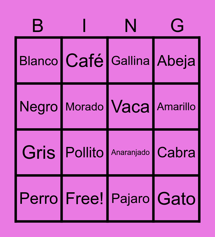 This bingo card has 24 words: Rojo, Azul, Amarillo, Verde, Negro, Blanco, Morado, Café, Free!, Rosa, Gris, Anaranjado, Caballo, Oveja, Vaca, Puerco, Pajaro, Gallina, Pollito, Cabra, Perro, Gato, Abeja and El burro.