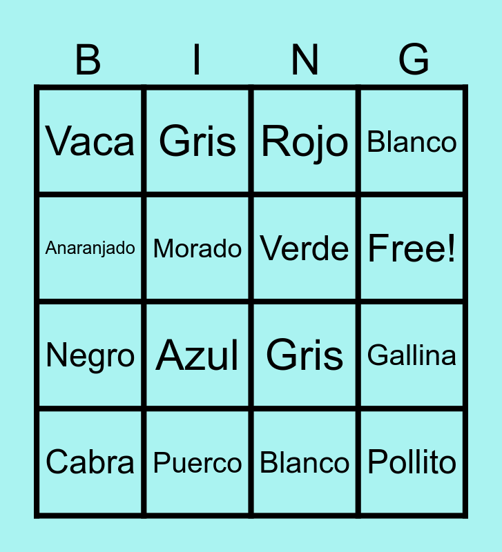 This bingo card has 35 words: Rojo, Azul, Amarillo, Verde, Negro, Blanco, Morado, Café, Free!, Rosa, Gris, Anaranjado, Caballo, Oveja, Vaca, Puerco, Pajaro, Gallina, Pollito, Cabra, Perro, Gato, Abeja, El burro, Rojo, Azul, Amarillo, Verde, Negro, Blanco, Morado, Café, Rosa, Gris and Anaranjado.