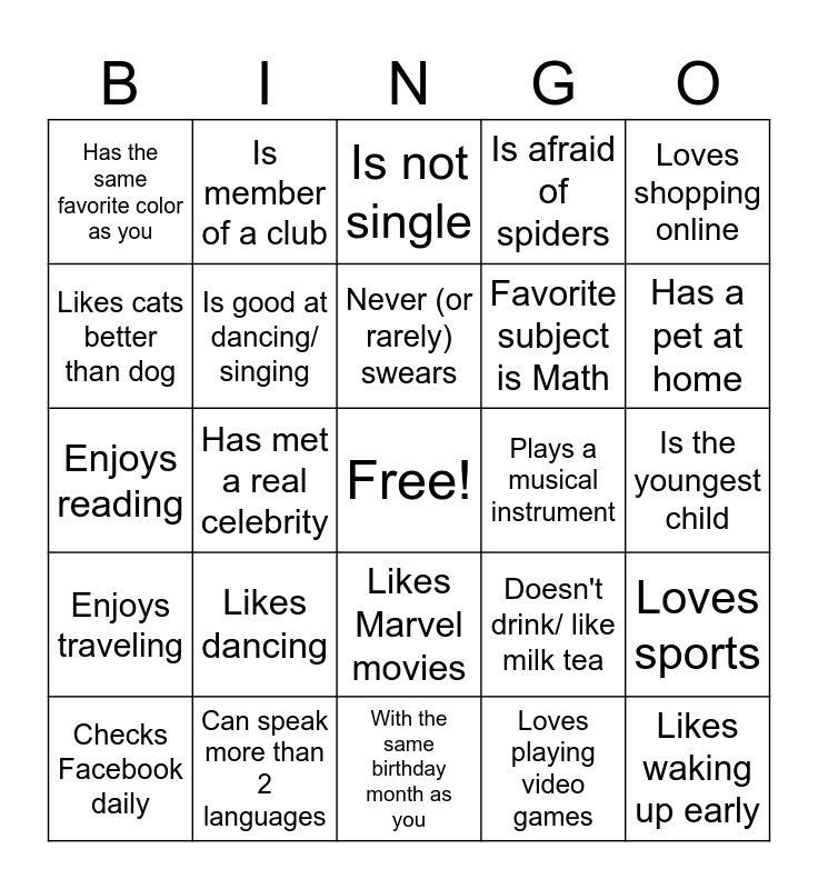 This bingo card has a free space and 24 words: Likes dancing, Can speak more than 2 languages, Never (or rarely) swears, Checks Facebook daily, Loves shopping online, Has the same favorite color as you, Likes cats better than dog, Is member of a club, Plays a musical instrument, Likes Marvel movies, Favorite subject is Math, Enjoys reading, Doesn't drink/ like milk tea, Loves sports, Is good at dancing/ singing, Loves playing video games, Is the youngest child, Is not single, Has a pet at home, Has met a real celebrity, Likes waking up early, Enjoys traveling, Is afraid of spiders and With the same birthday month as you.