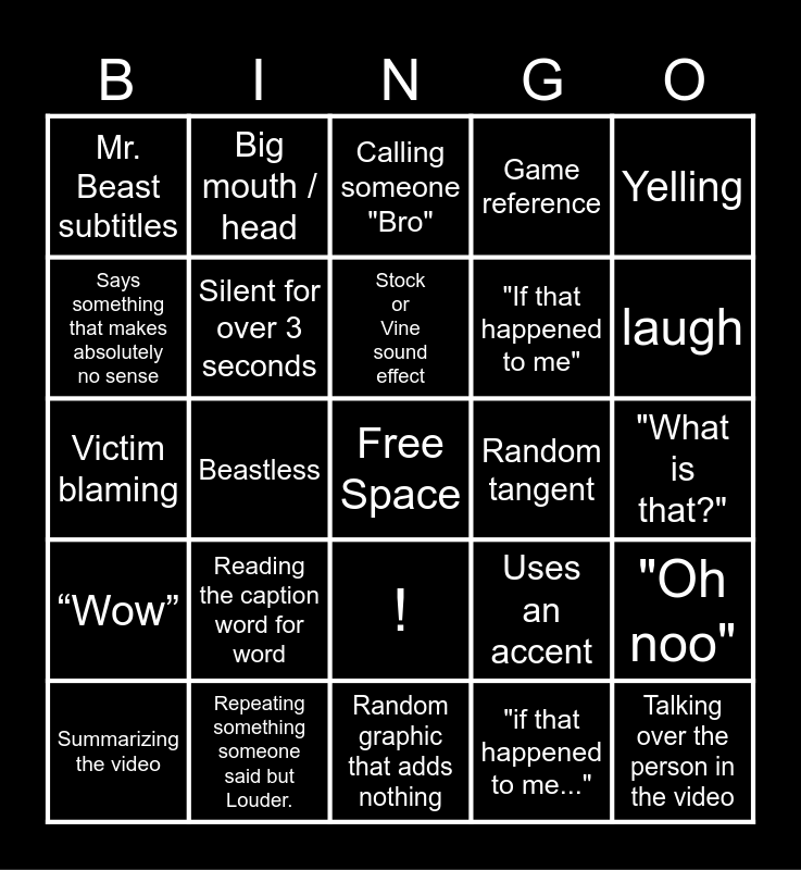 This bingo card has a free space and 27 words: Uses an accent, Pog, "If that happened to me", Random graphic that adds nothing, Says something that makes absolutely no sense, Calling someone "Bro", Big mouth / head, “Wow”, Random tangent, "Oh noo", Victim blaming, Game reference, Summarizing the video, Repeating something someone said but Louder., laugh, "Gasp", Silent for over 3 seconds, Stock or Vine sound effect, Reading the caption word for word, Mr. Beast subtitles, "What is that?", "if that happened to me...", Beastless, Talking over the person in the video, !, Yelling and MONEY MONEY MONEY.
