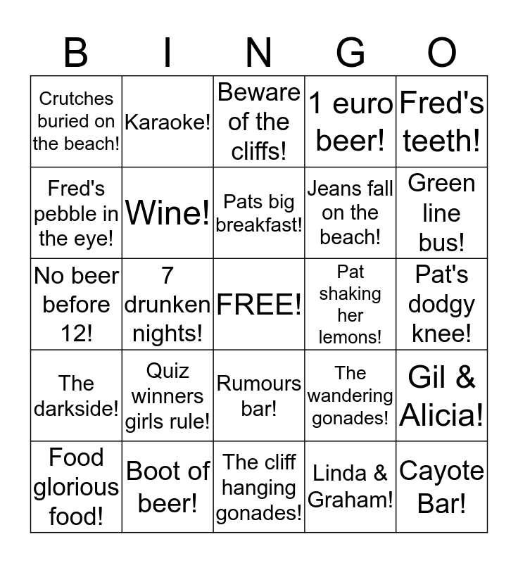 This bingo card has a free space and 24 words: Quiz winners girls rule!, Boot of beer!, Pats big breakfast!, Food glorious food!, Fred's teeth!, Crutches buried on the beach!, Fred's pebble in the eye!, Karaoke!, Pat shaking her lemons!, Rumours bar!, Jeans fall on the beach!, No beer before 12!, The wandering gonades!, Gil & Alicia!, Wine!, Linda & Graham!, Pat's dodgy knee!, Beware of the cliffs!, Green line bus!, 7 drunken nights!, Cayote Bar!, The darkside!, 1 euro beer! and The cliff hanging gonades!.