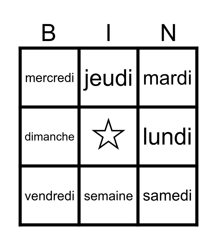 This bingo card has a free space and 8 words: lundi, mardi, jeudi, vendredi, mercredi, samedi, dimanche and semaine.