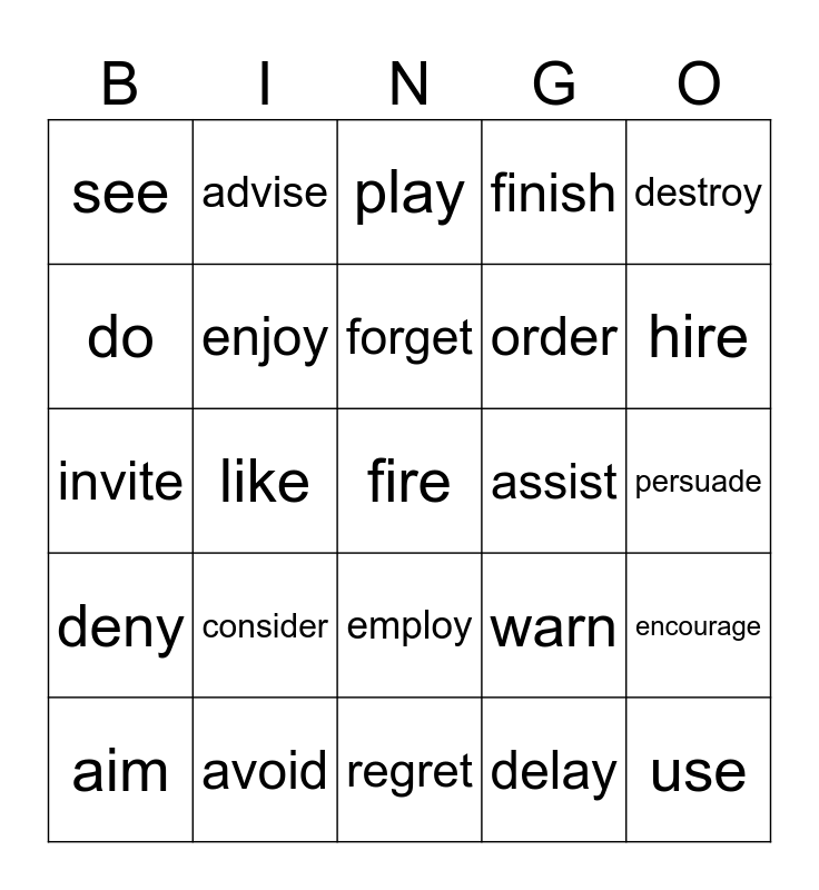 This bingo card has 25 words: consider, regret, forget, aim, destroy, see, do, advise, assist, employ, order, invite, warn, encourage, enjoy, use, persuade, play, hire, like, fire, avoid, deny, finish and delay.
