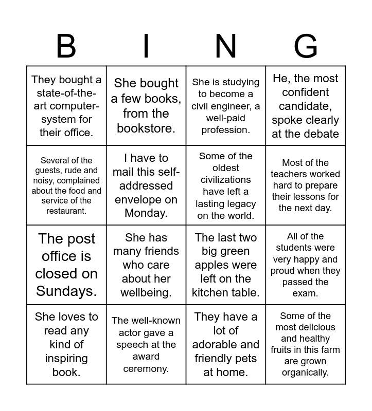 This bingo card has 40 words: Free!, The last two big green apples were left on the kitchen table., A lot of small animals, rabbits and hamsters, are sold at the pet stores, Some of the oldest civilizations have left a lasting legacy on the world., A few of the newest and most expensive cars were parked outside the hotel., The children received a gift from Santa Claus, a kind and generous man., Most of the teachers worked hard to prepare their lessons for the next day., Several of the guests, rude and noisy, complained about the food and service of the restaurant., Several of the guests, rude and noisy, complained about the food and service of the restaurant., Some of the most delicious and healthy fruits in this farm are grown organically., All of the students were very happy and proud when they passed the exam., He, the most confident candidate, spoke clearly at the debate, She loves to read any kind of inspiring book., They have a lot of adorable and friendly pets at home., The well-known actor gave a speech at the award ceremony., She works as a part-time teacher-assistant at the local school., He is a fan of the sci-fi horror genre of movies and books., They bought a state-of-the-art computer-system for their office., She wore a blue-and-white striped dress for the party., She is studying to become a civil engineer, a well-paid profession., They went to the coffee shop, a cozy place., He is a fan of rock music, a genre that originated in the 1950s and 1960s., The post office is closed on Sundays., I have to mail this self-addressed envelope on Monday., She loves to read science fiction novels, She buys science fiction novels, especially those with well-developed characters., He bought a coffee maker from the second-hand store., He bought a coffee maker from the second-hand store., The ice cream truck was parked outside the school, She wore a blue-green dress with a matching hat and shoes for the party., She wore a blue-green dress with a matching hat and shoes., Some of the students passed the midterm exam with flying colors., Some of the students passed the midterm exam with flying colors, She has many friends who care about her wellbeing., She has many friends who care about her wellbeing., He ate all of the popcorn, his favorite snack, during the movie., He ate all of the popcorn, his favorite snack, during the movie., She bought a few books from the bookstore., She bought a few books, from the bookstore. and He has no interest in sports, unlike his brother..