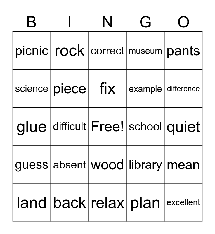 This bingo card has a free space and 24 words: absent, back, fix, land, pants, picnic, science, rock, school, wood, example, glue, library, mean, piece, plan, quiet, correct, difference, difficult, excellent, guess, museum and relax.