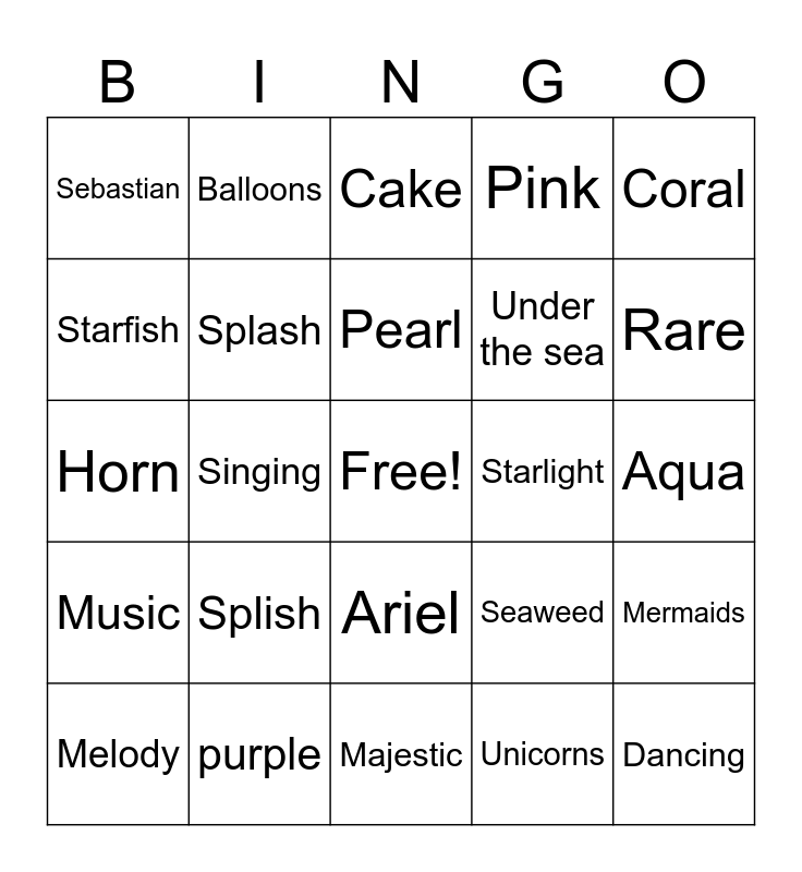 This bingo card has a free space and 28 words: Mermaids, Water, Under the sea, Unicorns, Starfish, Cake, Balloons, Music, Starlight, Melody, Horn, Pink, purple, Majestic, Rare, Magical, Splish, Splash, Pearl, Ariel, Sebastian, Ocean, Dancing, Singing, Aqua, Seaweed, Coral and Stardust.