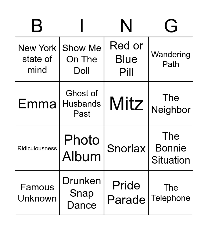 This bingo card has 16 words: Drunken Snap Dance, The Bonnie Situation, Red or Blue Pill, New York state of mind, Ridiculousness, Show Me On The Doll, Snorlax, Pride Parade, Emma, Ghost of Husbands Past, Famous Unknown, Wandering Path, Photo Album, The Neighbor, Mitz and The Telephone.