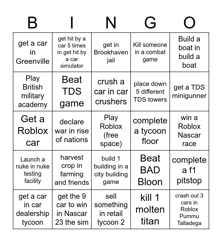 This bingo card has a free space and 24 words: get a car in car dealership tycoon, harvest crop in farming and friends, crush a car in car crushers, kill 1 molten titan, Build a boat in build a boat, get a car in Greenville, get hit by a car 5 times in get hit by a car simulator, get in Brookhaven jail, complete a tycoon floor, win a Roblox Nascar race, Get a Roblox car, Beat TDS game, Beat BAD Bloon, complete a f1 pitstop, Play British military academy, get the 9 car to win in Nascar 23 the sim, sell something in retail tycoon 2, Kill someone in a combat game, get a TDS minigunner, Launch a nuke in nuke testing facility, declare war in rise of nations, build 1 building in a city building game, place down 5 different TDS towers and crash out 3 cars in Roblox Pummu Talladega.