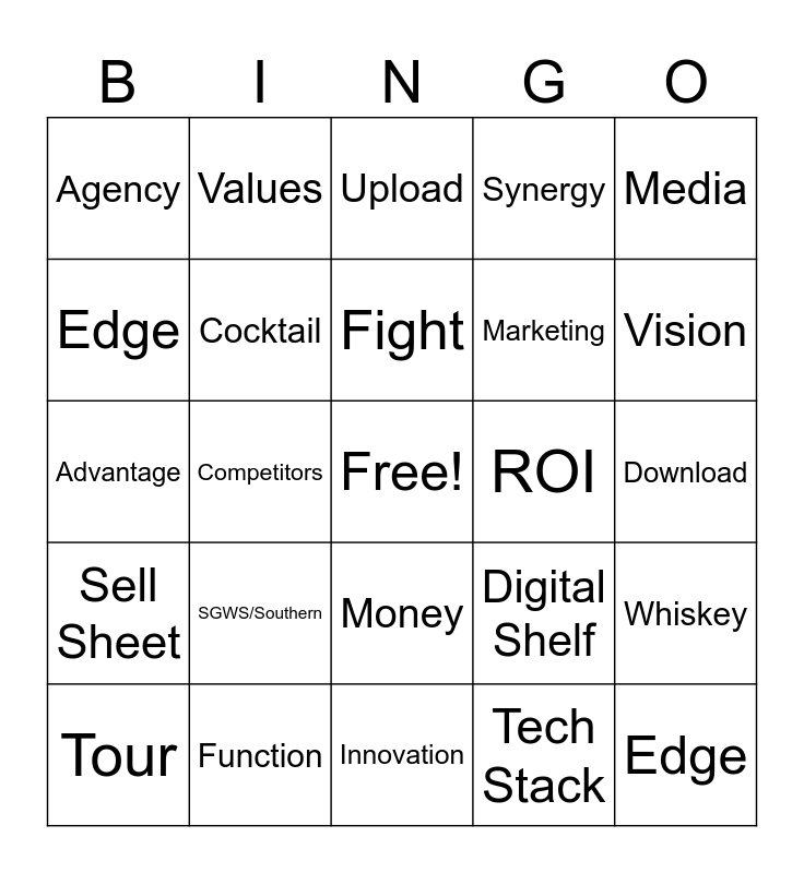 This bingo card has a free space and 25 words: SGWS/Southern, Innovation, Fight, Tour, Media, Agency, Edge, Values, ROI, Money, Marketing, Advantage, Digital Shelf, Whiskey, Cocktail, Asset, Download, Upload, Vision, Competitors, Edge, Function, Sell Sheet, Synergy and Tech Stack.