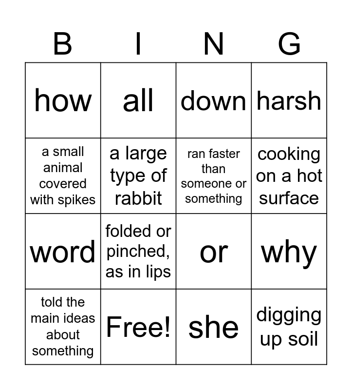 This bingo card has 16 words: Free!, why, down, how, word, all, or, she, a small animal covered with spikes, a large type of rabbit, told the main ideas about something, harsh, folded or pinched, as in lips, cooking on a hot surface, ran faster than someone or something and digging up soil.