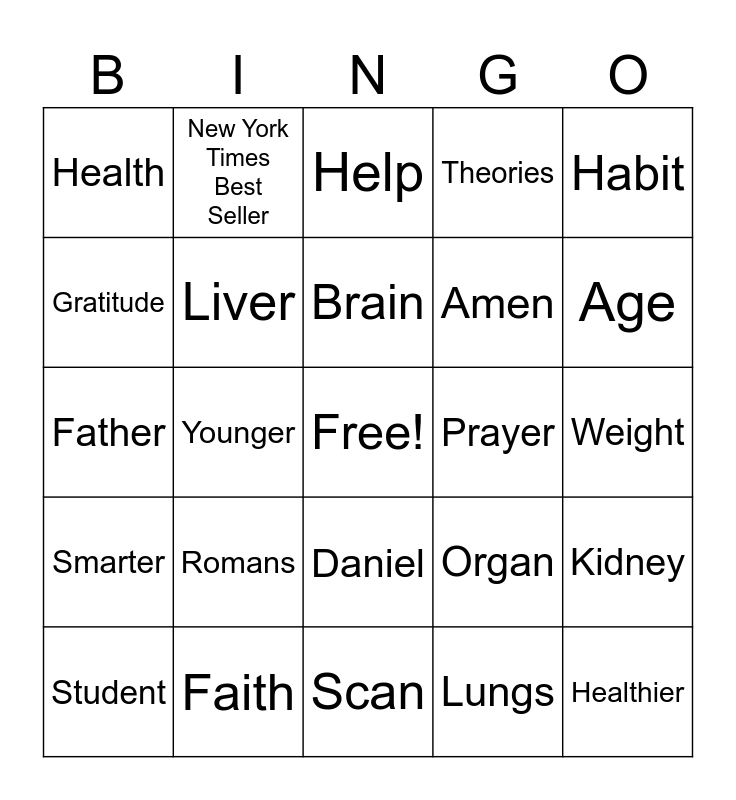 This bingo card has a free space and 24 words: Romans, Faith, Brain, Student, Habit, Health, Gratitude, New York Times Best Seller, Prayer, Daniel, Amen, Father, Organ, Kidney, Liver, Lungs, Weight, Help, Age, Younger, Healthier, Smarter, Theories and Scan.