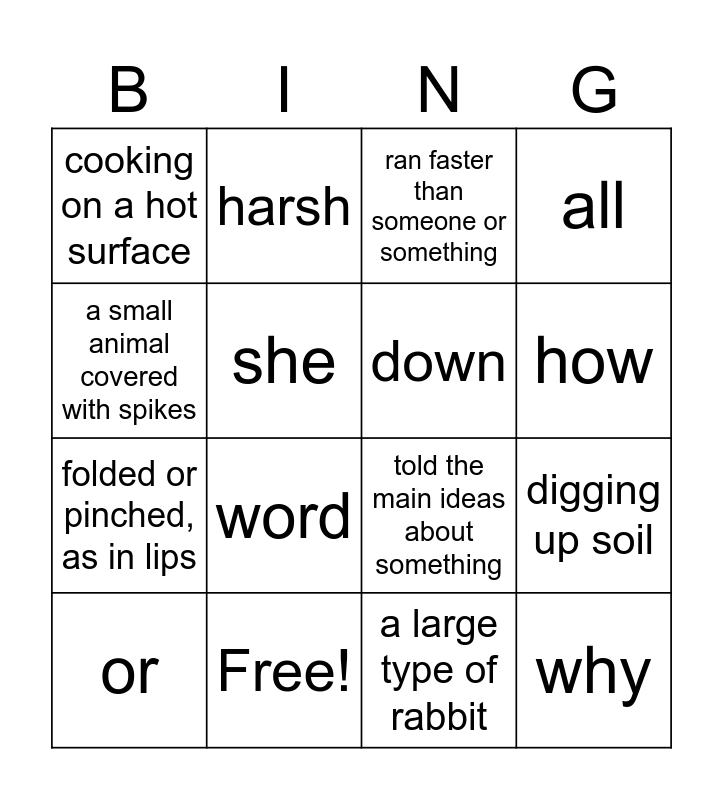 This bingo card has 16 words: Free!, digging up soil, ran faster than someone or something, cooking on a hot surface, folded or pinched, as in lips, harsh, told the main ideas about something, a large type of rabbit, a small animal covered with spikes, she, or, all, word, how, down and why.