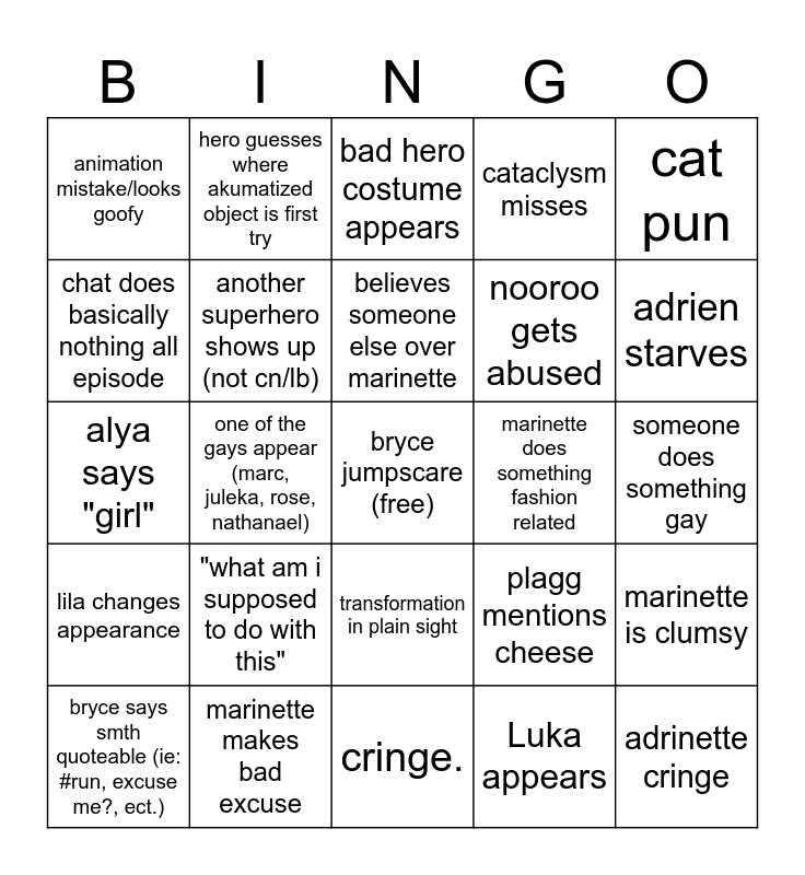 This bingo card has a free space and 26 words: transformation in plain sight, Luka appears, believes someone else over marinette, marinette makes bad excuse, cat pun, animation mistake/looks goofy, chat does basically nothing all episode, hero guesses where akumatized object is first try, someone does something gay, plagg mentions cheese, nooroo gets abused, alya says "girl", marinette is clumsy, bryce says smth quoteable (ie: #run, excuse me?, ect.), one of the gays appear (marc, juleka, rose, nathanael), tom or sabine appear, cataclysm misses, lila changes appearance, bad hero costume appears, adrinette cringe, adrien starves, cringe., marinette does something fashion related, "what am i supposed to do with this", another superhero shows up (not cn/lb) and juleka speaks.